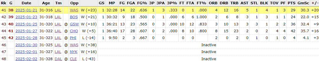左证数据统计,戴维斯在湖东说念主生计终末的齐全一战为1月28日对阵黄蜂,全场他28中17砍下42分23篮板的超等两双数据。