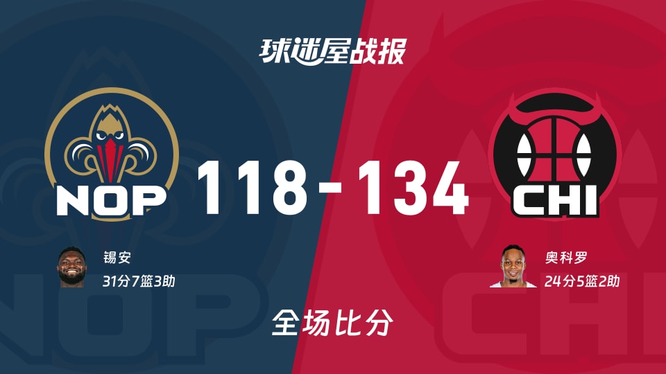 球迷屋1月1日讯,2025-2026赛季NBA惯例赛连接进行中,本场比赛由公牛主场迎战鹈鹕,过程一轮对攻大战,最终公牛凭债主场上风,势如破竹,以134-118治服鹈鹕。鹈鹕:锡安31分7板3助、普尔26分3板2助、贝16分4板3助;公牛:奥科罗24分5板2助、琼斯20分2板12助、布泽利斯19分6板2助。