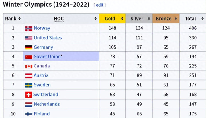 在冬奥历史上,加拿大队拿下77金72银76铜,奖牌榜排行高达第五位。而前五里有如故不存在的苏联队。